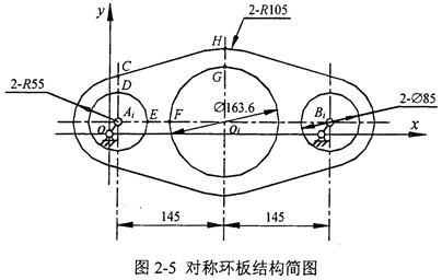 對稱B型三環(huán)減速機(jī)的一塊環(huán)板的結(jié)構(gòu)如圖2-13所示,它的受力情況和坐標(biāo)系統(tǒng)取如圖2-14所示,符號(hào)的標(biāo)定及含義同對稱A稱三環(huán)減速機(jī)。