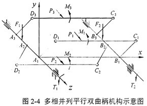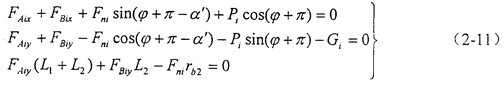 上式方程數(shù)為9個(gè),而方程中未知量的總數(shù)為12個(gè),故存在3個(gè)多余未知量。根據(jù)前述的變形協(xié)調(diào)條件,建立3個(gè)變形協(xié)調(diào)方程,作為機(jī)構(gòu)受力分析的補(bǔ)充方程,利用高斯消元法即可求解。