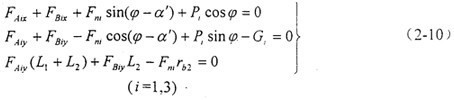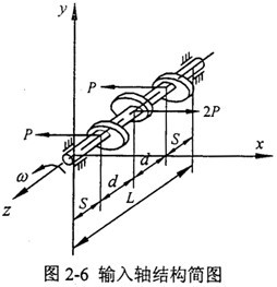 三環(huán)減速機(jī)箱體支承軸承周期性的作用力是箱體振動(dòng)的激振力,是三環(huán)減速機(jī)振動(dòng)的根源,因此對箱體支承軸承的作用力作深入的探討實(shí)屬必要。對于一級(jí)輸入袖8和二級(jí)輸出軸2來說,軸上作用有輪齒嚙合力、齒輪和軸的重力和兩個(gè)支承軸承的作用力。從理論上講,由于是雙輸入軸輸入,嚙合力沿嚙合線長度方向均勻分布,則嚙合力相互平衡,支承軸承只剩下齒輪和軸重力的作用,作用力的求解變得極其簡單。即使考慮載荷分配不均勻的影響,它們的支承軸承作用力的求解也相對容易。下面著重探討一下一級(jí)輸出二級(jí)輸入軸支承軸的作用力。