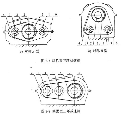 偏置型三環(huán)減速機(jī)的環(huán)板軸承所受載荷比對稱型三環(huán)減速機(jī)大很多,在設(shè)計(jì)和實(shí)際使用中應(yīng)盡量避免采用這種結(jié)構(gòu)布置形式。雖然對稱B型和偏置型三環(huán)減速機(jī)的受力性能不如對稱A型三環(huán)減速機(jī),但是由于它們的兩個(gè)輸入軸比較接近,故而易于實(shí)現(xiàn)雙驅(qū)動(dòng)。