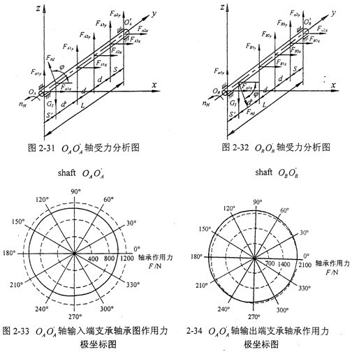 由2.3.3分析可知:當(dāng)求得環(huán)板上的軸承作用力FAix、FAiy,F(xiàn)Bix、FBiy后,通過輸入軸和支承軸的受力分析,不難求得箱體上各軸承的作用力。兩根一級(jí)輸出二級(jí)輸入軸的受力分析如圖2-31、2-32所示。