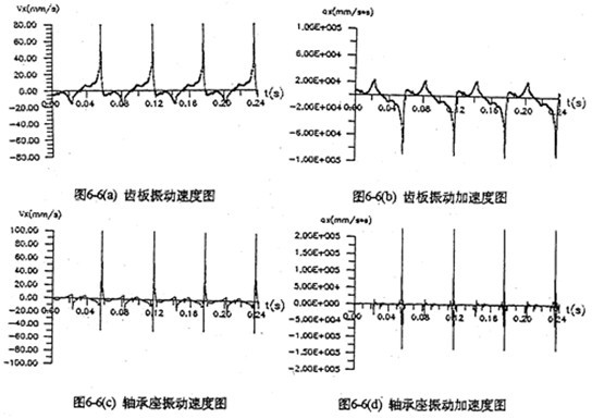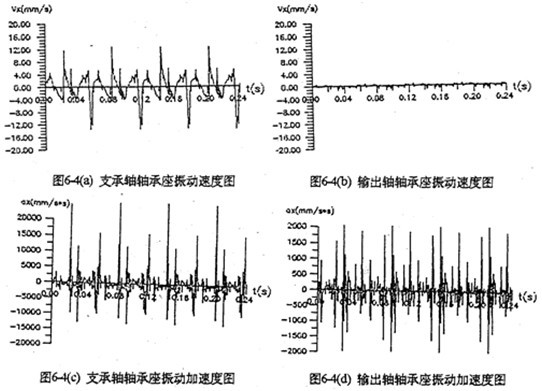 圖6-4是支承軸軸承座及輸出軸軸承座的振動速度及振動加速度時域圖。圖(c)中,一個周期內(nèi)的三根較長的沖擊棒線分別是三相機構(gòu)因死點引起的嚙合沖擊。軸承座的振動速度比齒板的振動速度小,但振動加速度比齒板振動加速芳略大,最大值為
