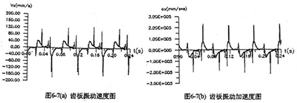 圖6-7是某相雙曲柄機構(gòu)在輸入端具有0.03mm間隙時,齒板及軸承座的振動速度、振動加速度。圖中表明,速度、加速度都在兩個死點位置出現(xiàn)較大的沖擊值。