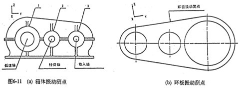 為了將理論分析的結(jié)果與振動測試分析結(jié)果對比印證,將測點選在三個箱體軸承座及齒板支承軸孔的上邊緣,如圖6-11所示。