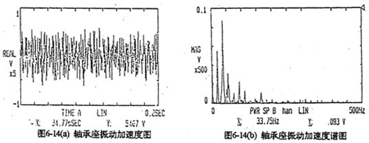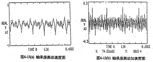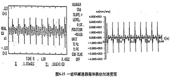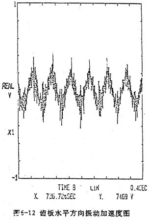 由于每片齒板都存在同樣的周期性激勵沖擊函數(shù),相位差120°,迭加后的總效果仍然是轉(zhuǎn)頻周期函數(shù)。因此對箱體軸承座的沖擊也呈周期性。圖6-13是支承軸箱體軸承座的振動速度及加速度的實測時域曲線圖。其曲線圖的變化規(guī)律及幅值與圖6-4完全接近。速度及速度沖擊值為