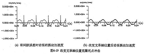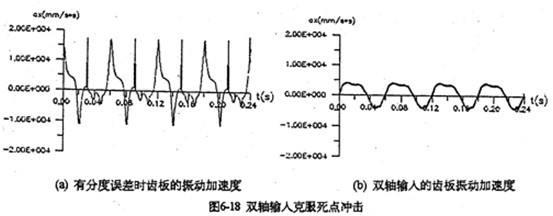 采用雙軸輸人的齒板及箱體軸承座振動速度、加速度如圖6-17所示。從圖看出齒板速度及加速度值明顯變。閱屋S輸人時的0.3倍),而且無沖擊,完全屬于穩(wěn)太振動。箱體的振動速度及加速度幅值只是單軸輸人時的0.2倍。圖6-18a是一軸的偏心套存在0.05度的分度誤差時齒板的加速度曲線圖,圖中明顯出現(xiàn)加速度沖擊棒線。采用雙軸輸入后,死點沖擊被徹底(見圖6-18b) , 變成穩(wěn)態(tài)振動曲線了。因此,為了減小三環(huán)減速器的振動,有必要加大三環(huán)減速器的橫向尺寸,在箱體內(nèi)增加一套雙軸輸入的齒輪功率分流機構(gòu),或者在箱體外另設計一套功率分流機構(gòu),以解決機構(gòu)過死點的振動問題。
