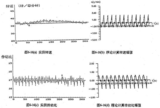 由于機構(gòu)的變形及誤差等原因,將使輸出轉(zhuǎn)速及傳動比動變化,沖擊箱體、產(chǎn)生振動。圖6-16是對SHLEO15 型三環(huán)減速器實測及理論計算的轉(zhuǎn)速和傳動比隨時間變化的波動曲線。輸出轉(zhuǎn)速對比為