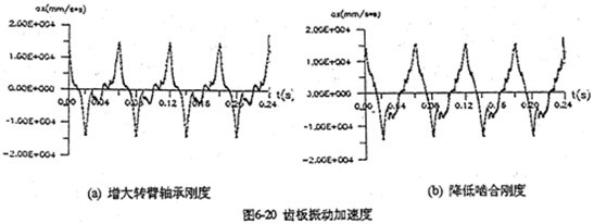 增大行星軸承剛度的目的在于減小雙曲柄機構(gòu)的變形,降低死點沖擊幅值。并且使各相嚙合力均衡化、減小嚙合沖擊。圖6-20是分別將行星軸承剛度增加一個數(shù)量級和內(nèi)齒圈降低一個數(shù)量級時齒板的振動加速度。兩者加速度幅值均降低了1/4 倍左右。