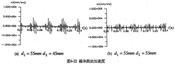 增加高速軸的剛度是降低沖擊載荷的重要途徑。軸的剛度大(值徑大),扭轉(zhuǎn)、彎曲變形小,雙曲柄機構(gòu)變形也就小,這樣既減小了沖擊振動、又增加了軸的強度。圖6-22將高速軸的直徑由原來的45mm加到55mm后的,振動加速度圖。