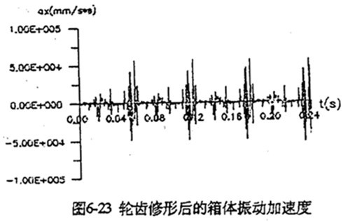 在上一章已經(jīng)分析過,當三軸水平布置而且高速軸在輸出軸的同側(cè)時,載荷幅值最大,各相嚙合力等都很不均衡(見圖5-24)。圖6-19是將支承軸布置在輸入軸與輸出軸間的150°位置時齒板的振動加速度。由圖可知,因誤差引起的沖擊已被完全克服,而且原有的穩(wěn)態(tài)幅值也降低了很多。