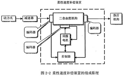 該柔性速度補(bǔ)償裝置設(shè)計(jì)為二個(gè)獨(dú)立的單元,安裝在減速器和執(zhí)行機(jī)構(gòu)之間。如圖2-2所示,簡單而言其組成包括:一個(gè)二自由度機(jī)構(gòu)、一個(gè)伺服電機(jī)、一個(gè)控制器以及三套編碼器?刂破魍ㄟ^編碼器監(jiān)控二自由度機(jī)構(gòu)的輸出軸(即執(zhí)行機(jī)構(gòu)的輸入軸)的速度,若速度波動超過預(yù)設(shè)的許用值,則控制伺服電機(jī)調(diào)整二自由度機(jī)構(gòu)的一個(gè)輸入,從而實(shí)現(xiàn)速度波動的柔性補(bǔ)償。