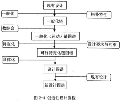 本文則采用顏鴻森與黃以文提出的一套程序化的創(chuàng)造性設(shè)計(jì)法來完成設(shè)計(jì),它可用于系統(tǒng)地構(gòu)想出符合特定設(shè)計(jì)要求與約束,并與可行的現(xiàn)有設(shè)計(jì)完成相同或相似任務(wù)的機(jī)械裝置全部可能的拓?fù)錁?gòu)造。