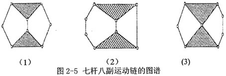 對于(5,5)來說,只有一種連接方式,作為一種混合動力驅(qū)動系統(tǒng)已有人做過研究,在本論文中,不能滿足設(shè)計(jì)要求,因此不可;而(9,11)及以上又有40個(gè)(或更多)運(yùn)動鏈之多,且構(gòu)件多結(jié)構(gòu)復(fù)雜,研究起來非常困難,暫不考慮;先考慮(7,8)七桿八副機(jī)構(gòu),其構(gòu)建數(shù)量不是太多,結(jié)構(gòu)不是太復(fù)雜,共有3個(gè)運(yùn)動鏈(如圖2-5),特定化后又有11種(排除同構(gòu)的機(jī)構(gòu))特定化導(dǎo)出機(jī)構(gòu),可以從中選擇可能適合的方案,因此以下將對(7,8)來詳細(xì)分析研究。