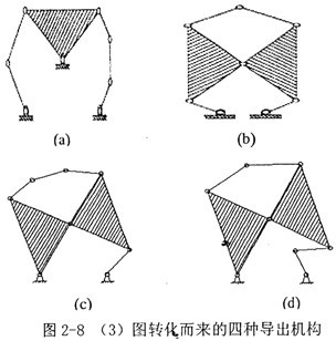 由(3)圖,取不同的構(gòu)件為機(jī)架,經(jīng)過特定化后,也可轉(zhuǎn)化為四種導(dǎo)出機(jī)構(gòu),如圖2-8。