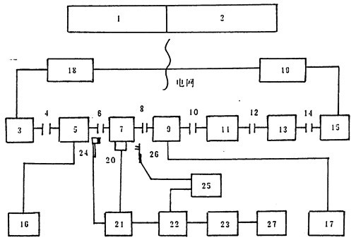 試驗(yàn)時(shí),通過(guò)控制臺(tái)1,2調(diào)節(jié)控制系統(tǒng)讓交直流機(jī)組18發(fā)出適當(dāng)?shù)闹绷麟妷菏怪绷鳒y(cè)功機(jī)3(工作于恒速電動(dòng)工況)按恒定轉(zhuǎn)速轉(zhuǎn)動(dòng),通過(guò)聯(lián)軸器4,6和輸入轉(zhuǎn)速扭矩傳感器5與試件7輸放端(高速端)相聯(lián)接。試件7輸出端通過(guò)聯(lián)軸器8,10,12,14及輸出扭矩傳感受器9、升速用11、汽車變速箱13而與直流測(cè)功機(jī)15(工作于恒電流工況)聯(lián)接,驅(qū)使其發(fā)出適當(dāng)電壓的直流電,再通過(guò)交直流機(jī)組19將其逆變成為工頻北流電返回電網(wǎng),完成整個(gè)電功率封閉閉鏈。