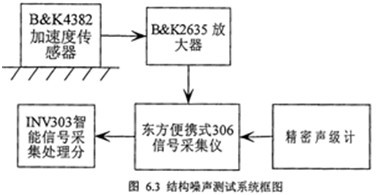 在測試產對所有的加速度傳感器,放大器及數據自動采集處理系統(tǒng)進行校準,對規(guī)定的所有測點進行打磨,平磨并做好標記,測試時在規(guī)定工況下依次將傳感器磁性底座放在各測點上。傳感器測得的振動信號(包括速度級和加速度級振動信號)經電荷放大器放大后進入16通道卡式采集儀進行采集記錄,用智能動態(tài)信號分析儀分析各測點的1/3倍頻程度級結構噪聲,再對所有的測點的結構噪聲值做對數平均,得到總的結構噪聲頻譜圖?諝庠肼曈寐暭売嫓y量減速裝置各個測點的A計權聲壓級和1/1倍頻程聲壓級。各測點距齒輪箱測量表面的距離為1米。測試前已用標準噪聲源HY203-93260對聲級計進行校準。測試系統(tǒng)框圖如圖6.3所示。測試設備如下:
