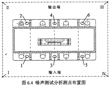 結構振動噪聲測試在齒輪箱安裝基腳布置6個測點,測點布置圖見圖3中1-6測點,在每一測點上按31.5Hz~5kHz1/3倍頻中心頻率測試加速度級頻譜(re:a0=10-6m/s)和1/3倍頻中心頻率測試速度級頻譜(re:a0=5*10-8m/s)。空氣噪聲測試聲壓級基準2*10-5Pa,用聲級計上的A計權聲壓級和1/1倍頻程聲壓級測量減速齒輪裝置各個測點。各測點距齒箱測量表面的距離為1米。測點位置見測點布置圖6.4中Ⅰ-Ⅳ測點。