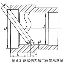 由于圓柱正弦活齒減速器徑向尺寸小,在現有國產銑刀的條件下,加工殼體的內空間正弦滾道具有很大的難度,本文提出一種加工方案,較好的解決了這個難題。采用五坐標數控加工中心,將球狀銑刀傾斜一定角度,斜插進殼體內圓柱面進行銑削加工,其加工位置示意圖如圖6-2。