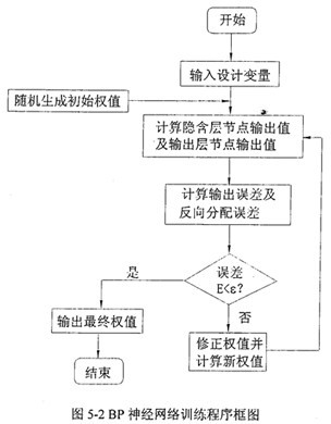 三層前饋型BP網(wǎng)絡(luò)采用BP算法來(lái)調(diào)整網(wǎng)絡(luò)連接權(quán)值和節(jié)點(diǎn)閾值。BP算法,即誤差逆?zhèn)鞑W(xué)習(xí)方法,是一種曲型的誤差修正方法。BP算法是一個(gè)種有教師的學(xué)習(xí)算法,整個(gè)網(wǎng)絡(luò)學(xué)習(xí)過(guò)程由信息的正向傳動(dòng)播和誤差的反向傳播兩上階段構(gòu)成,在正向傳播的過(guò)程中,輸入信息從輸入層經(jīng)隱含層逐層處理,并傳向輸出層,如果不能在輸出層得到期望的輸出,則轉(zhuǎn)入反向傳播,運(yùn)用梯度下降法連接權(quán)關(guān)于誤差函數(shù)的導(dǎo)數(shù)沿原來(lái)的連接通路返回,通過(guò)修改各層的權(quán)值使得誤差函數(shù)減小,直到達(dá)到收斂為止。神經(jīng)網(wǎng)絡(luò)練過(guò)程如圖5-2所示。