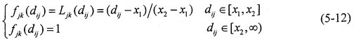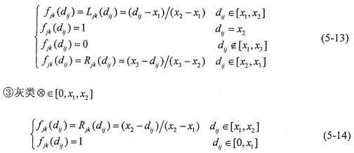4.進(jìn)行灰色聚類  對(duì)象矩陣進(jìn)行聚類,聚類類別選為“1”、“2”、“3”三類時(shí),其白化權(quán)函數(shù)分別與式(5-12)~(5-14)和圖5-4對(duì)應(yīng)。