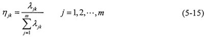 對(duì)象矩陣進(jìn)行聚類,聚類類別選為“1”、“2”、“3”三類,其白化函九分別與式(5-12)~(5-14)和圖5-4對(duì)應(yīng)。現(xiàn)以f1為例,說(shuō)明求得白化函數(shù)閾值的方法。對(duì)應(yīng)象矩陣中的第一列,d(max)=1;d(mean)=0.917,取0.9,d(min)=0.8621,取0.86。因此,對(duì)于灰類1,有x1=0,x2=1;對(duì)于灰類2,有x1=0,x2=0.9,x3=2×x2=1.8;對(duì)于灰類3,有x1=0.86,x3=2×x1=1.72。同理可求出其余各分目標(biāo)各類白化權(quán)的閾值,代入式(5-12)~(5-14)中求出各類白化權(quán)函數(shù)及其值。按式(5-15)求出標(biāo)定聚類權(quán)矩陣η