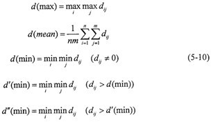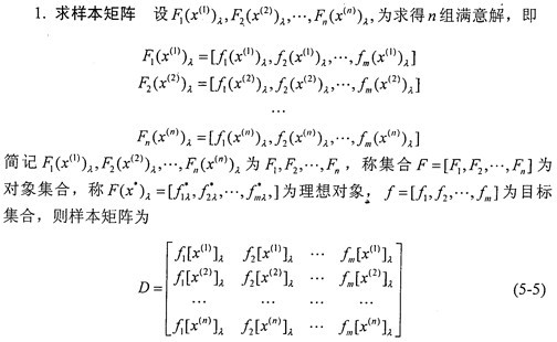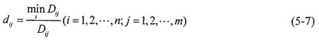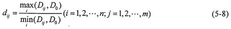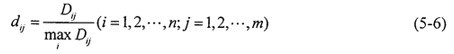 2.求轉(zhuǎn)換樣本矩陣  即象矩陣  由于指標(biāo)不同,要求不同,因此有必要按上限效果測(cè)度、下限效果測(cè)度、中心效果測(cè)度來(lái)統(tǒng)一樣本。當(dāng)指標(biāo)要求“越大越好”時(shí),可用上限效果測(cè)度,記統(tǒng)一后的樣本為dij,則有