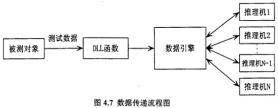 根據(jù)流程圖可知,從故障測試數(shù)據(jù)到數(shù)據(jù)引擎,有兩種數(shù)據(jù)處理方式,一種是故障測試數(shù)據(jù)由數(shù)據(jù)采集系統(tǒng)采集后,可先進行預處理,將故障信號數(shù)據(jù)處理為推理機所需的故障特征數(shù)據(jù),然后發(fā)送出去,動態(tài)連接庫DLL函數(shù)則通過網(wǎng)絡接收這些故障特征數(shù)據(jù),同時對照推理機向數(shù)據(jù)引擎申請的故障特征變量,將申請的故障特征變量對應的值找出,按數(shù)據(jù)引擎規(guī)定的格式反送給申請數(shù)據(jù)的推理機。另一種是故障測試數(shù)據(jù)由數(shù)據(jù)采集系統(tǒng)采集后,按一定格式直接發(fā)送出去,動態(tài)連接庫DLL函數(shù)則通過網(wǎng)絡接收這些故障信息數(shù)據(jù),然后再進行數(shù)據(jù)預處理,將故障信息數(shù)據(jù)處理為推理機所需的故障特征數(shù)據(jù),同時對照推理機向數(shù)據(jù)引擎申請的故障特征變量,將申請的故障特征變量對應的值找出,再按數(shù)據(jù)引擎規(guī)定的格式反送給申請數(shù)據(jù)的推理機。