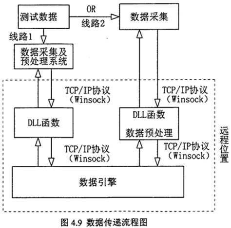 網(wǎng)絡化遠程故障診斷的實現(xiàn),其關鍵是遠程數(shù)據(jù)的傳送、存貯及數(shù)據(jù)交換處理。故障診斷系統(tǒng)遠離故障設備現(xiàn)場,只要故障現(xiàn)場故障測試數(shù)據(jù)能即時通過網(wǎng)絡傳送到故障診斷系統(tǒng)中,故障診斷系統(tǒng)即能實現(xiàn)網(wǎng)絡化遠程故障診斷。當智能故障診斷中的推理機進行推理時,通過數(shù)據(jù)引擎向動態(tài)連接庫DLL函數(shù)申請數(shù)據(jù),這些數(shù)據(jù)是推理時需要的故障特征參數(shù)變量值。動態(tài)連接庫DLL函數(shù)則通過網(wǎng)絡直接從故障現(xiàn)場測試采集計算機中得到故障信息數(shù)據(jù)。數(shù)據(jù)傳送流程圖如圖4.9 所示。