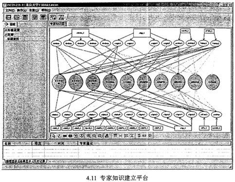 專家知識輸入引擎模塊內容如圖4.3所示,該模塊的核心是用圖形化的方式建立診斷推理流程圖,該流程圖是由分布三個層次上的多個節(jié)點及節(jié)點間的連線所組成,如圖4.4。診斷推理流程圖中,底層為“數(shù)據(jù)”層,這里的數(shù)據(jù),可以是測量參數(shù)、傳感器的輸出、工作狀態(tài)、檢修記錄等多種廣泛意義上的參數(shù),中間層為“故障現(xiàn)象”層,這里的癥狀現(xiàn)象可以是能直接觀察到的現(xiàn)象(如工作條件、參數(shù)范圍、參數(shù)變化等),也可以是間接的現(xiàn)象,即多種廣泛意義上的現(xiàn)象。最上層為“故障原因”層。用連線相連彼此相關的“數(shù)據(jù)”與“故障現(xiàn)象”或“故障現(xiàn)象”與“故障原因”。這樣構成診斷推理流程圖。