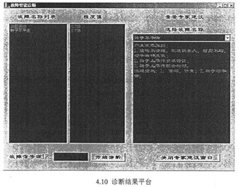 根據(jù)給出的數(shù)據(jù)端口及數(shù)據(jù)格式,即可按用戶的要求設計診斷結果輸出平臺。診斷結果應給出診斷故障的名稱、故障發(fā)生的部位,故障發(fā)生的時間及程度。對于不同的故障,提示故障發(fā)生的可能原因,給出相應的專家建議或維修方法等。圖4.10為本文集成系統(tǒng)的診斷結果輸出用戶界面。圖4.11為本文集成系統(tǒng)的專家知識庫建立及診斷推理平臺。