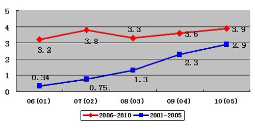 2006年至20010年雖然總量有較大的增長(zhǎng),但增長(zhǎng)速度趨緩。