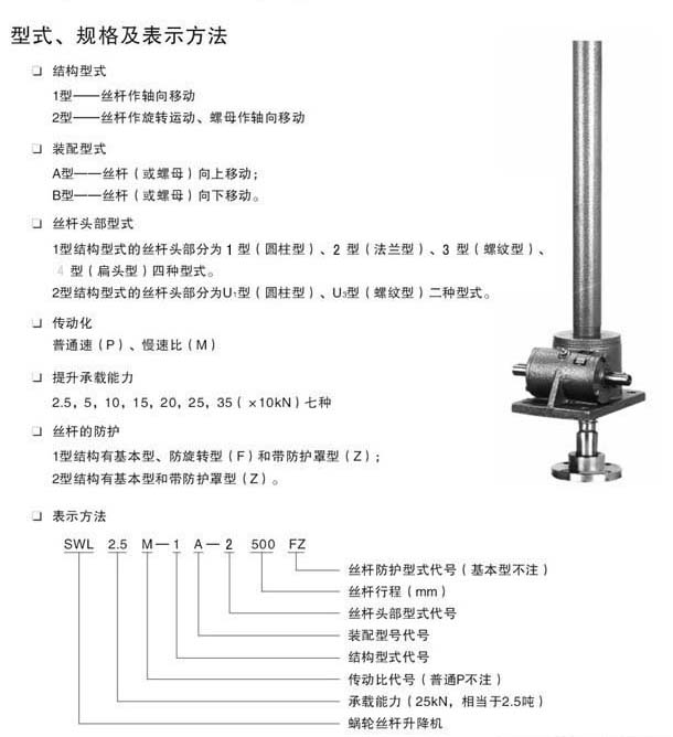 絲杠升降機(jī)廣泛應(yīng)用于機(jī)械、冶金、建筑、水利設(shè)備等行業(yè),具有起升、下降及借助輔件推進(jìn)、翻轉(zhuǎn)及各種高度位置調(diào)整等諸多功能.SWL蝸輪絲杠升降機(jī)是一種基礎(chǔ)起重部件,具有結(jié)構(gòu)緊湊、體積小、重量輕、動(dòng)力源廣泛、無(wú)噪音、安裝方便、使用靈活、功能多、配套形式多、可靠性高、使用壽命長(zhǎng)等許多優(yōu)點(diǎn)。可以單臺(tái)或組合使用,能按一定程序準(zhǔn)確地控制調(diào)整提升或推進(jìn)的高度,可以用電動(dòng)機(jī)或 其他動(dòng)力直接帶動(dòng),也可以手動(dòng)。它有不同的結(jié)構(gòu)形式和裝配形式,且提升高度可按用戶的要求定制。 。該裝置可以自鎖