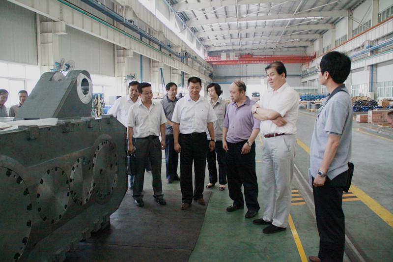 中傳重裝總經(jīng)理李圣強(qiáng)(右三)陪同神華神東董事長(zhǎng)張子飛(右二)一行參觀中傳重裝大采高全直齒傳動(dòng)搖臂裝配現(xiàn)場(chǎng)