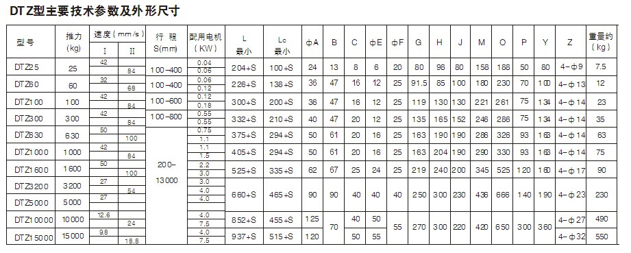 電動(dòng)推桿按額定推力目前分為25、100、300、500、700、1000、1600、3200、5000、10000、20000、30000公斤等12個(gè)等級(jí),按行程為100、200、300、400、500、600、700、800、900、1000、1100、1200、1300毫米,每種行程又有42或84,50或100,26.6或53.2兩種速度。