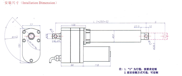 最短安裝距離:L(梯形絲桿)=250mm+S