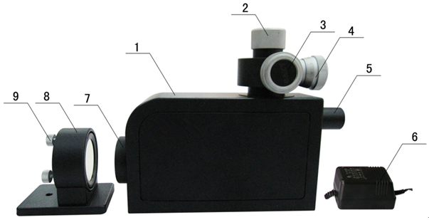 6、變壓器   7、望遠(yuǎn)物鏡   8、可調(diào)式反射鏡   9、調(diào)節(jié)螺釘