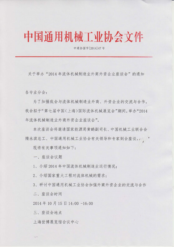 關(guān)于舉辦“2014年流體機(jī)械制造業(yè)外商外資企業(yè)座談會”的通知