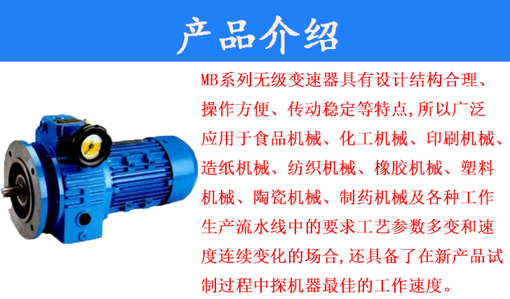 MB系列無級變速器具有設(shè)計結(jié)構(gòu)合理、操作方便、傳動穩(wěn)定等特點,所以廣泛應(yīng)用于食品機械、化工機械、印刷機械、造紙機械、紡織機械、橡膠機械、塑料機械、陶瓷機械、制藥機械及各種工作生產(chǎn)流水線中的要求工藝參數(shù)多變和速度連續(xù)變化的場合,還具備了在新產(chǎn)品試制過程中探求機器最佳的工作速度。