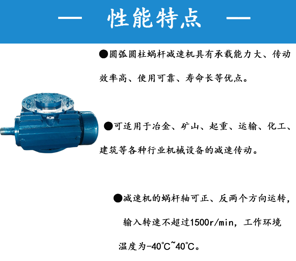 圓弧圓柱蝸桿減速機(jī)具有承載能力大、傳動(dòng)效率高、使用可靠、壽命長(zhǎng)等優(yōu)點(diǎn),可適用于冶金、礦山、起重、運(yùn)輸、化工、建筑等各種行業(yè)機(jī)械設(shè)備的減速傳動(dòng)。減速機(jī)的蝸桿軸可正、反兩個(gè)方向運(yùn)轉(zhuǎn),輸入轉(zhuǎn)速不超過1500r/min,工作環(huán)境溫度為-40℃-40℃。