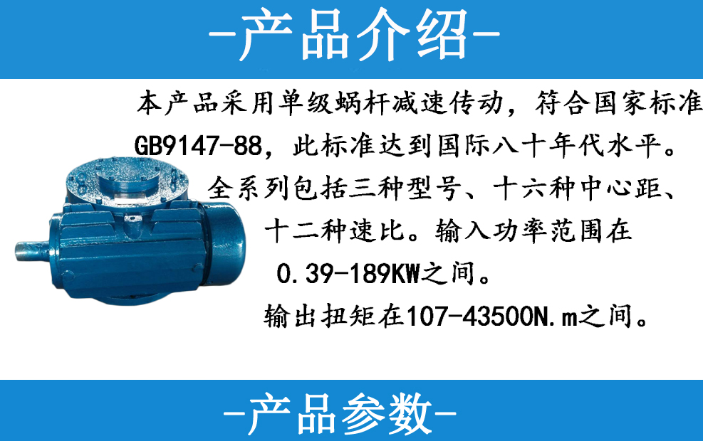 本產(chǎn)品采用單級(jí)蝸桿減速傳動(dòng),符合國(guó)家標(biāo)準(zhǔn)GB9147-88,此標(biāo)準(zhǔn)達(dá)到國(guó)際八十年代水平。全系列包括三種型號(hào)十六種中心距、十二種速比。輸入功率范圍在039-18K之間,輸出扭矩在107-43500Nm之間。