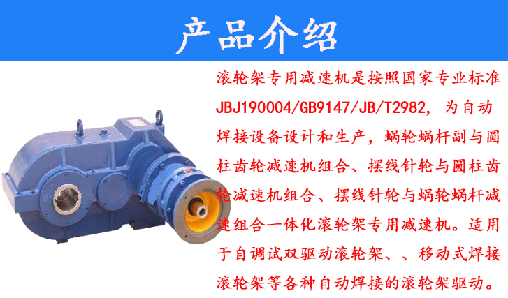 滾輪架專用減速機(jī)是按照國家專業(yè)標(biāo)準(zhǔn)JB19004/GB9147/JB/T2982,為自動(dòng)焊接設(shè)備設(shè)計(jì)和生產(chǎn)的,蝸輪蝸桿副與圓柱齒輪減速機(jī)組合、擺線針輪與圓柱齒輪減速機(jī)組合,擺線針輪與蝸輪蝸桿減速組合一體化滾輪架專用減速機(jī)。適用于自調(diào)式雙驅(qū)動(dòng)滾輪架、移動(dòng)式焊接滾輪架等各種自動(dòng)焊接的滾輪架驅(qū)動(dòng)。