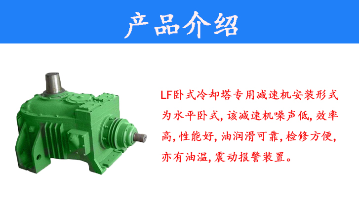 LF臥式冷卻塔專用減速機(jī)安裝形式為水平臥式,該減速機(jī)噪聲低,效率高,性能好,油潤滑可靠,檢修方便,亦有油溫,震動(dòng)報(bào)警裝置。