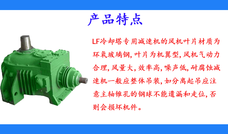 LF冷卻塔專用減速機(jī)的風(fēng)機(jī)葉片材質(zhì)為環(huán)氧玻璃鋼,葉片為機(jī)翼型,風(fēng)機(jī)氣動(dòng)力合理,風(fēng)量大,效率高,噪聲低,耐腐蝕減速機(jī)一般應(yīng)整體吊裝,如分離起吊應(yīng)注意主軸錐孔的鋼球不能遺漏和走位,否則會(huì)損壞機(jī)件。