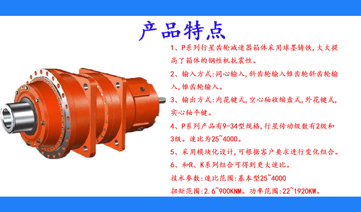 1、P系列行星齒輪減速器箱體采用球墨鑄鐵,大大提高了箱體的鋼性機抗震性。