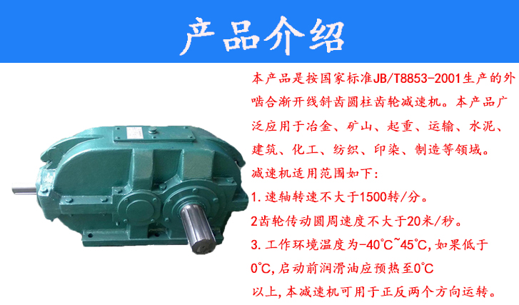 DBY、DCY、DFY系列減速器分別為二級傳動、三級傳動和四級傳動的輸入、輸出軸位于垂直狀態(tài)的外嚙合齒輪傳動機構,符合JB/T8853-1999標準?扇〈鶶S型垂直軸減速器和ZQ、ZL、等舊型號減速器,亦可替代同類型國外進口減速器。