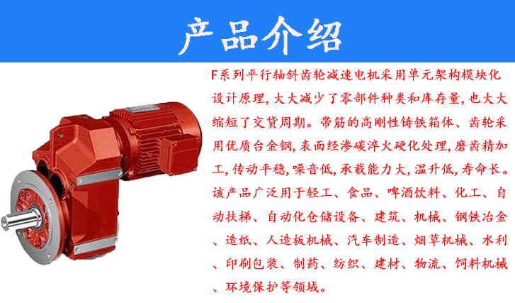 F系列平行軸斜齒輪減速電機(jī)采用單元架構(gòu)模塊化設(shè)計原理,大大減少了零部件種類和庫存量,也大大縮短了交貨周期。帶筋的高剛性鑄鐵箱體、齒輪采用優(yōu)質(zhì)臺金鋼,表面經(jīng)滲碳淬火硬化處理,磨齒精加工,傳動平穩(wěn),噪音低,承載能力大,溫升低,壽命長。該產(chǎn)品廣泛用于輕工、食品、啤酒飲料、化工、自動扶梯、自動化倉儲設(shè)備、建筑、機(jī)械、鋼鐵冶金、造紙、人造板機(jī)械、汽車制造、煙草機(jī)械、水利、印刷包裝、制藥、紡織、建材、物流、飼料機(jī)械、環(huán)境保護(hù)等領(lǐng)域。