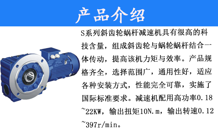 S系列齒輪蝸桿減速電機具有很高的科技含量,有斜齒輪與蝸輪蝸桿結(jié)合一體傳動,提高該機力矩與效率。該系列產(chǎn)品規(guī)格齊全,轉(zhuǎn)速范圍廣,通用性好,適應各種安裝方式,性能安全可靠壽命長,實施了國際標準要求。減速機配用高功率0.18~22KW,輸出轉(zhuǎn)距10N.m~4890N.m,輸出轉(zhuǎn)速.12~397r/mino