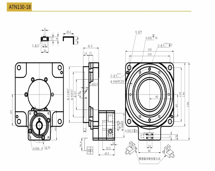 中空旋轉(zhuǎn)平臺通過電機(jī)驅(qū)動,實現(xiàn)角度調(diào)整自動化。精加工蝸輪蝸桿或齒輪傳動,角度調(diào)整無極限。精密軸系設(shè)計,保證精密高,承載大;步進(jìn)電機(jī)與傳動件通過進(jìn)口高品質(zhì)彈性聯(lián)軸器連接,排除空間和加工形位誤差。旋轉(zhuǎn)臺面外圈刻度直觀;標(biāo)準(zhǔn)接口,方便信號傳輸;手動手輪配置,電控手動均可。可選裝伺服電機(jī)或步進(jìn)電機(jī)。