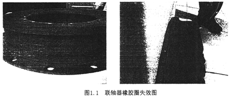 彈性聯(lián)軸器是應(yīng)用廣泛的機(jī)械零部件,在工業(yè)生產(chǎn),石油,化工,冶金等工業(yè)部門都有應(yīng)用,彈性聯(lián)軸器的使用狀況直接關(guān)系到機(jī)械設(shè)備的安全及壽命問題,尤其是一些重要場合,彈性聯(lián)軸器的失效問題往往引起人們的極大關(guān)注,例如某公司的GKZ型內(nèi)燃機(jī)車采用MTU16V396TC14型柴油機(jī)做內(nèi)燃機(jī)。MTU柴油機(jī)與風(fēng)扇偶合器采用萬向軸來傳遞動(dòng)力。為了緩和沖擊力,柴油機(jī)輸出軸與萬向軸聯(lián)接采用彈性聯(lián)軸器。0002#機(jī)車使用7年后,彈性聯(lián)軸器被剪斷,剪斷后的聯(lián)軸器如圖1.1所示。更換同種型號的彈性聯(lián)軸器后,使用未到一年又被剪斷,而同一型號的0001#,0003#機(jī)車使用時(shí)間以達(dá)9年,但彈性聯(lián)軸器依然完好如初。