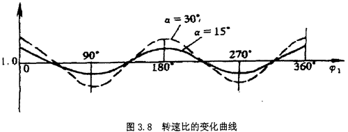 當(dāng)主動(dòng)轉(zhuǎn)子的回轉(zhuǎn)角速度為常數(shù)時(shí),從動(dòng)轉(zhuǎn)子的角速度是偏角和主動(dòng)轉(zhuǎn)子轉(zhuǎn)角的函數(shù)。當(dāng)或ф1=00或1800時(shí),ω2最大,當(dāng)ф2=900獲2700時(shí),ω2最小。其轉(zhuǎn)速比變化曲線如圖3.8所示,即有ω1cosa≤ω2